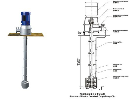 CLB型电动深井泵由双级离心泵、连接管及电机座,电机四大部件组成,电机座、电机安装在甲板上,离心泵及连接管安装在货舱内,浸没在货物中,传动轴支承在滚动轴承及特种塑料导轴承中,并通过弹性联轴器与电机相联接;传动轴的密 封采用机械密封结构,能适应各种化工介质的输送要求。
